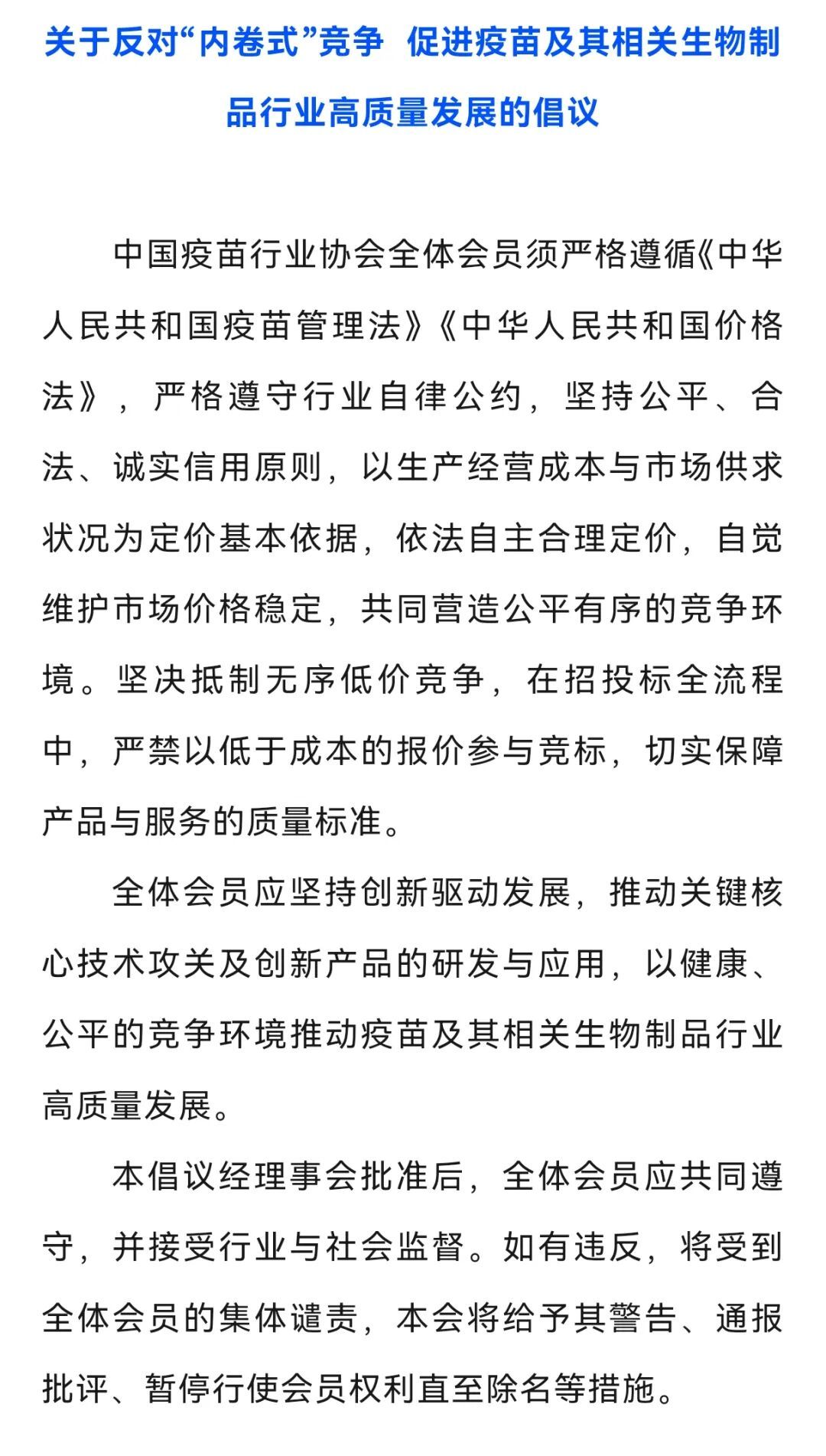11 月 19 日,中国疫苗行业协会发布《关于反对「内卷式」竞争,促进疫苗及其相关生物制品行业高质量发展的倡议》(下称《倡议》),要求会员单位在招投标全流程中,「严禁以低于成本的报价参与竞标」。[1]