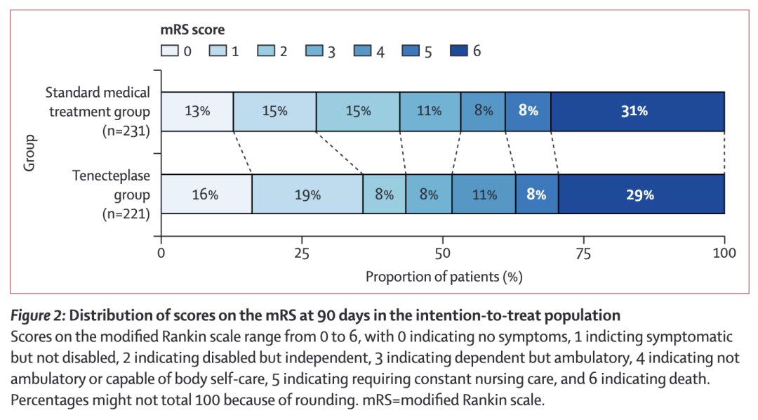 结果显示,在治疗后 90 天,桥接组和直接取栓组 mRS 评分 0~2 分的患者比例没有统计学差异,并且,两组在治疗 36 小时内症状性颅内出血的发生率(5.1% 和 2.6%)、治疗后 90 天死亡率(12.7% 和14.2%)方面也没有显著差异。[18]