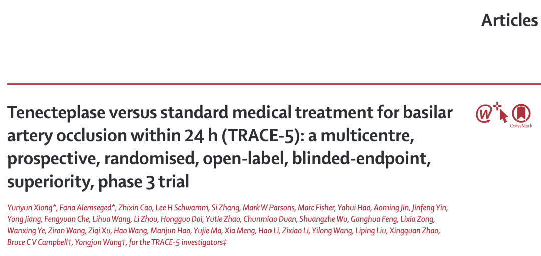 [3]Xiong, Yunyun, Fana Alemseged, Zhixin Cao, et al. “Tenecteplase versus Standard Medical Treatment for Basilar Artery Occlusion within 24 h (TRACE-5): A Multicentre, Prospective, Randomised, Open-Label, Blinded-Endpoint, Superiority, Phase 3 Trial.” The Lancet, February 2026, S0140673625026339. https://doi.org/10.1016/S0140-6736(25)02633-9.